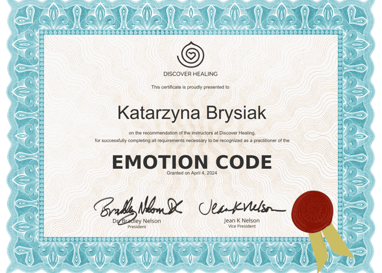 Stworzony przez dr. Bradleya Nelsona, Kod Emocji to metoda, która pozwala uwolnić stłumione emocje, mogące być źródłem różnych trudności. Kluczowym elementem tej techniki jest również zdejmowanie muru wokół serca – energetycznej bariery, która może ograniczać Twoją zdolność do miłości, akceptacji i tworzenia głębokich relacji.